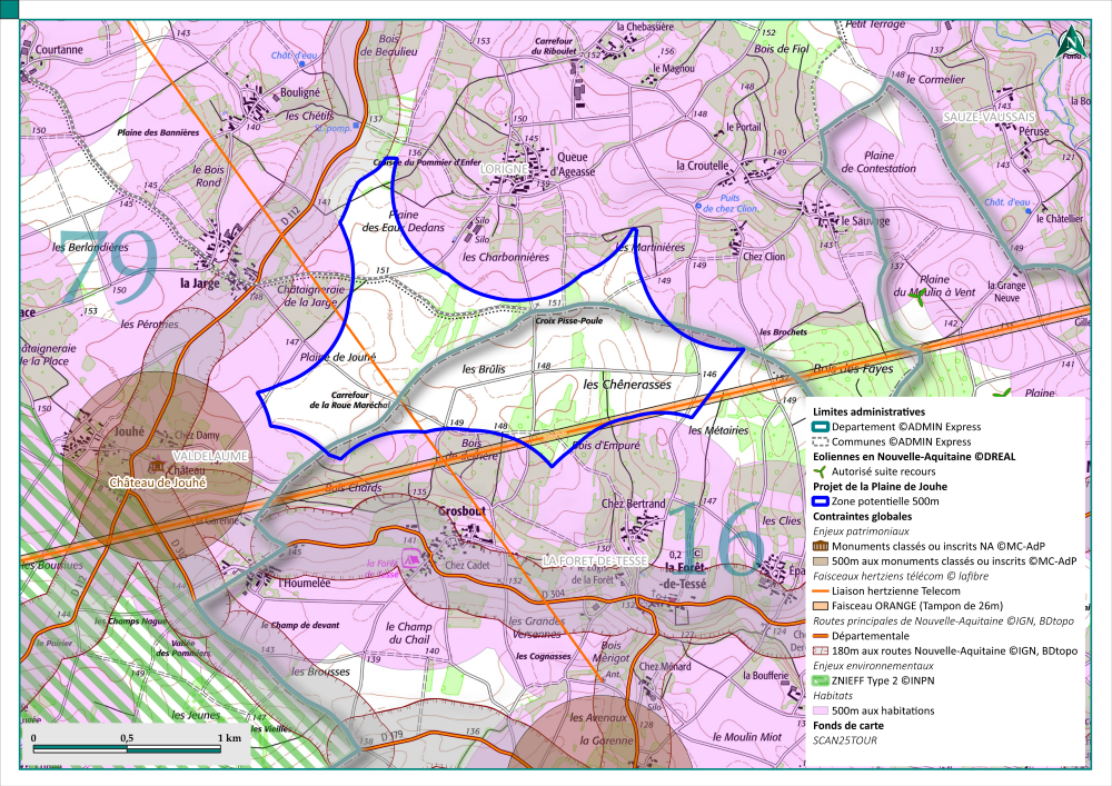 Les départements des Deux-Sèvres et de la Charente disposent de nombreux atouts pour développer une activité de production d’électricité d’origine éolienne. Le secteur d’étude se caractérise par des vents entre 6,5 et 7 m/s à 100m, particulièrement propice au développement de projets éoliens.