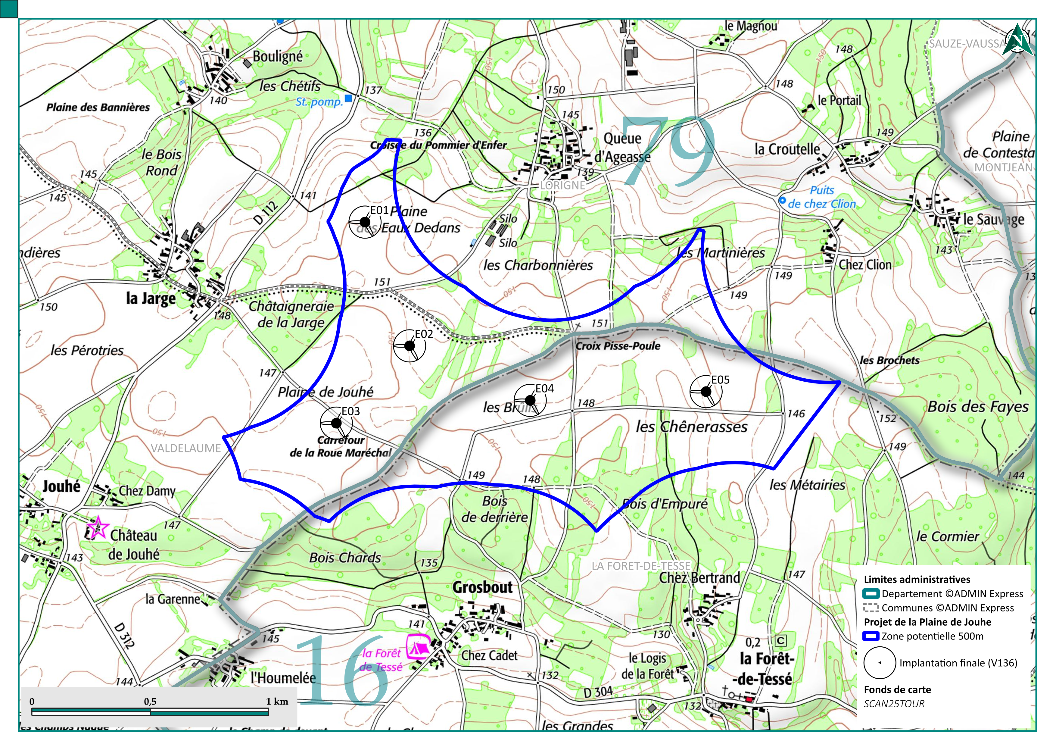 Le projet éolien de la Plaine de Jouhé est situé à la frontière de deux départements sur les communes de Valdelaume et Lorigné (en Deux-Sèvres) et la Forêt-de-Tessé (en Charente). Il est longé à l’Est par la route départementale D112 et au nord par la départementale D304.
